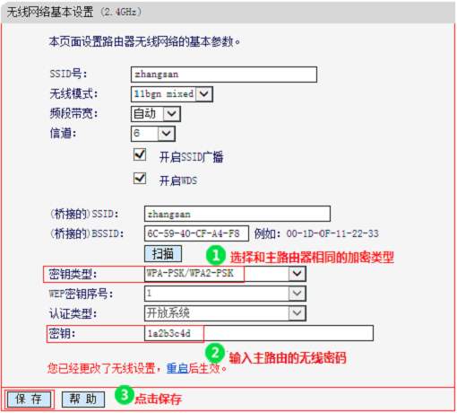 “密鑰類型”選擇與主路由器一致——>“密鑰”選項中,填寫主路由器的無線密碼——>點擊“保存”。