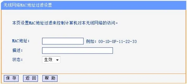 2、在“MAC地址”選項(xiàng)中,填寫(xiě)您自己的筆記本電腦MAC地址或手機(jī)的MAC地址——>“描述”可隨意填寫(xiě)——>“狀態(tài)”選擇:生效——>點(diǎn)擊“保存”。