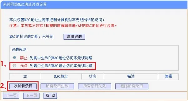 1、點(diǎn)擊“無(wú)線設(shè)置”——>“無(wú)線MAC地址過(guò)濾”——>然后選擇:允許列表中生效的MAC地址對(duì)應(yīng)的設(shè)備訪問(wèn)此無(wú)線網(wǎng)絡(luò)——>點(diǎn)擊“添加新條目”