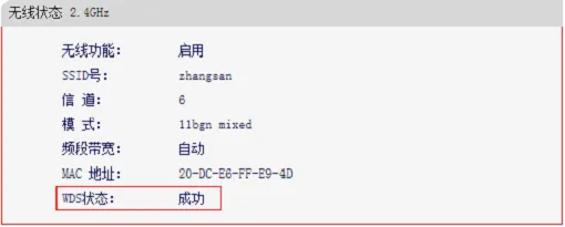 進(jìn)入副路由器的管理界面,選擇“運(yùn)行狀態(tài)” > “無線狀態(tài)”,查看“WDS狀態(tài)”。若顯示“成功”,表明無線橋接配置已完成。