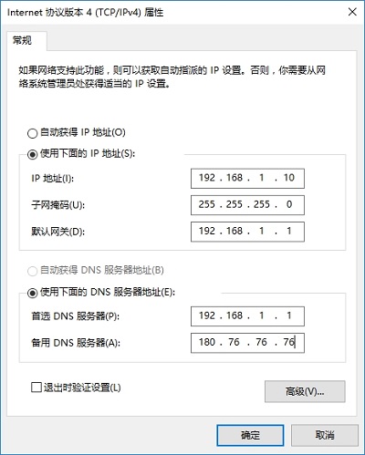 根據(jù)第1步的需求,臺式電腦需要單獨(dú)分配一定的寬帶值,因此需要為其設(shè)置一個(gè)固定的IP地址(例如設(shè)置為:192.168.1.10)。后續(xù)在設(shè)置限速時(shí)會(huì)用到此IP地址。而其他設(shè)備的寬帶資源大小相同,因此無需設(shè)置固定IP地址。