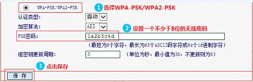 點(diǎn)擊“無(wú)線設(shè)置”——>“無(wú)線安全設(shè)置”——>選擇:WPA-PSK/WPA2-PSK——>設(shè)定“PSK密碼”——>點(diǎn)擊“保存”。