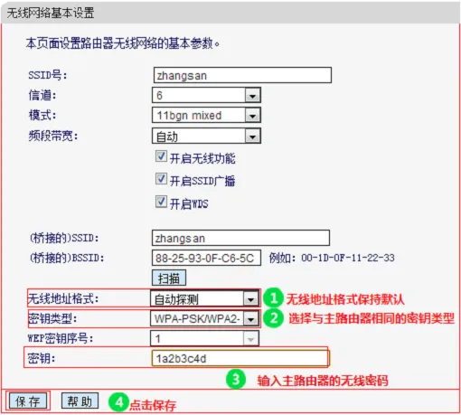 選擇與主路由器相同的“密鑰類型”——>在“密鑰”處輸入主路由器的無(wú)線密碼——>點(diǎn)擊“保存”。
