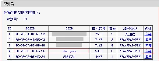 在掃描結(jié)果中,找到主路由器的SSID(例如本例中的:zhangsan),然后點(diǎn)擊后面的“連接”。