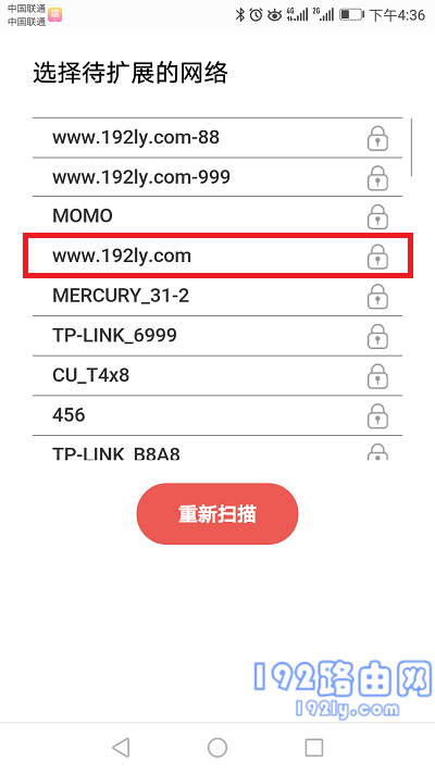 本文演示過程中,鴻哥需要擴(kuò)展 www.192ly.com 這個無線信號;因此,我在掃描結(jié)果中選擇了 www.192ly.com 這個無線信號,如下圖所示。