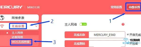 3、在第二臺(tái)幻影d126路由器的設(shè)置頁(yè)面內(nèi),依次點(diǎn)擊“高級(jí)設(shè)置”——>“無(wú)線設(shè)置”——>“WDS無(wú)線橋接”選項(xiàng),激活該功能。