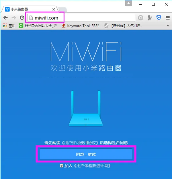 在瀏覽器中輸入:miwifi.com并按回車鍵——>點擊“同意、繼續(xù)”。
