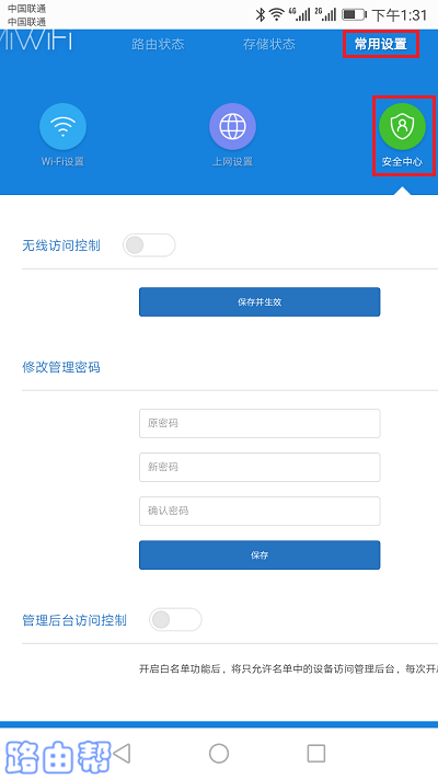 4、如需修改管理密碼,可進(jìn)入設(shè)置頁面后點(diǎn)擊:常用設(shè)置 ——> 安全中心 ——> 在顯示的新頁面中找到“修改管理密碼”的選項(xiàng),隨后便可重新設(shè)置一個(gè)新的管理密碼,如下圖所示。