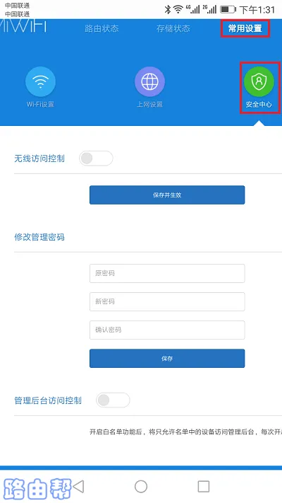 4、如果需要重新設(shè)定管理密碼,則需依次點擊:常用設(shè)置 ——> 安全中心。在隨后出現(xiàn)的頁面底部找到“修改管理密碼”這一選項,然后填寫原有的管理密碼并設(shè)定新密碼即可。