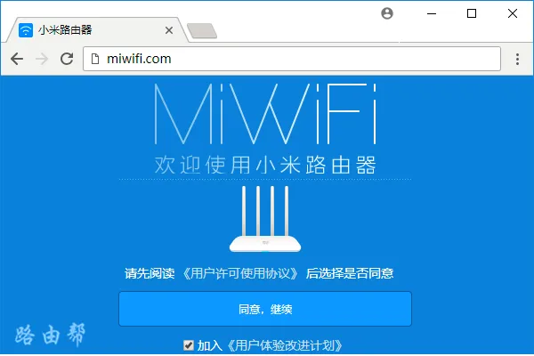 1、啟動電腦上的瀏覽器,在地址欄輸入 miwifi.com192.168.31.1,即可進入Redmi路由器AC2100的管理頁面,點擊“同意、繼續(xù)”按鈕。
