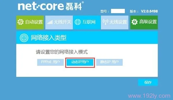 那么此時,“網(wǎng)絡(luò)接入類型”就應當選擇:動態(tài)IP用戶
