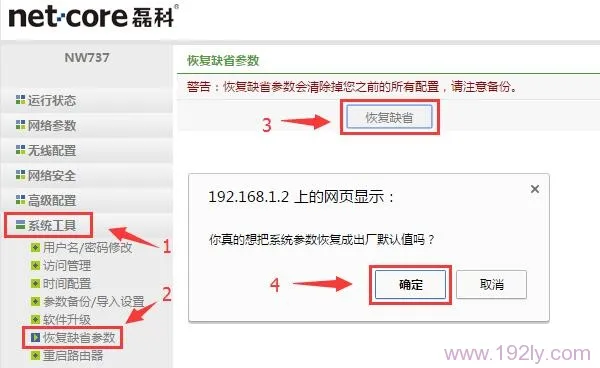 在NW717路由器的設(shè)置界面,執(zhí)行恢復(fù)出廠設(shè)置操作