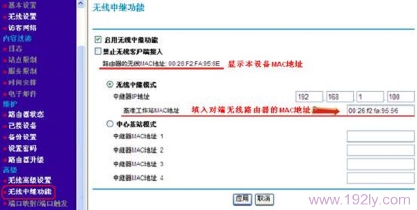 點(diǎn)擊左側(cè)的“高級(jí)”——>“無線中繼功能”——>勾選“啟用無線中繼功能”——>選擇“中心基站模式”——>“中繼器MAC地址 1”后面,填寫副路由器B的MAC地址,本例是:00:26:f2:95:6e——>點(diǎn)擊“應(yīng)用”。