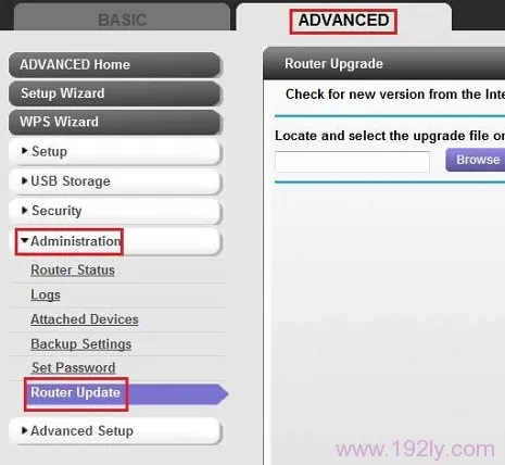 2、高級>管理>路由器升級(ADVANCED>Administration>Router Update)