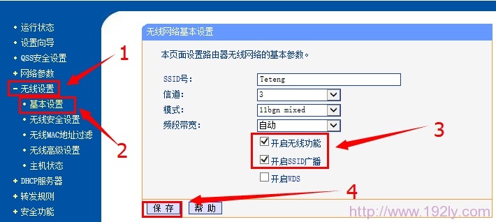 3、進(jìn)入“無線設(shè)置”菜單下的“基本設(shè)置”,確保勾選“開啟無線功能”以及“開啟SSID廣播”,最后點(diǎn)擊“保存”按鈕。