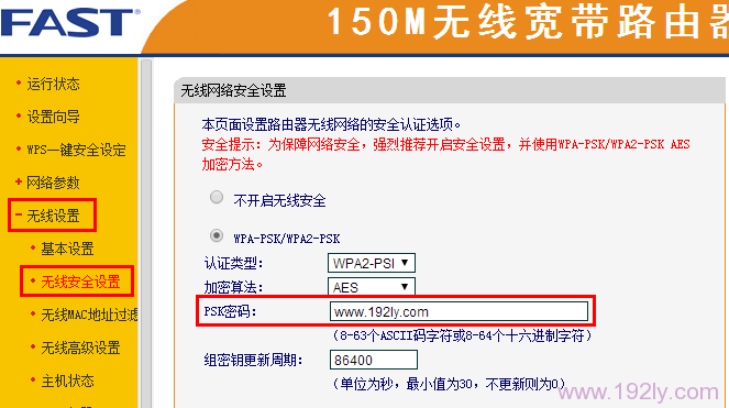 2、進(jìn)入管理頁(yè)面后,依次點(diǎn)擊“無(wú)線設(shè)置”——>“無(wú)線安全設(shè)置”——>找到“PSK密碼”,這里顯示的就是當(dāng)前無(wú)線路由器的WiFi密碼。