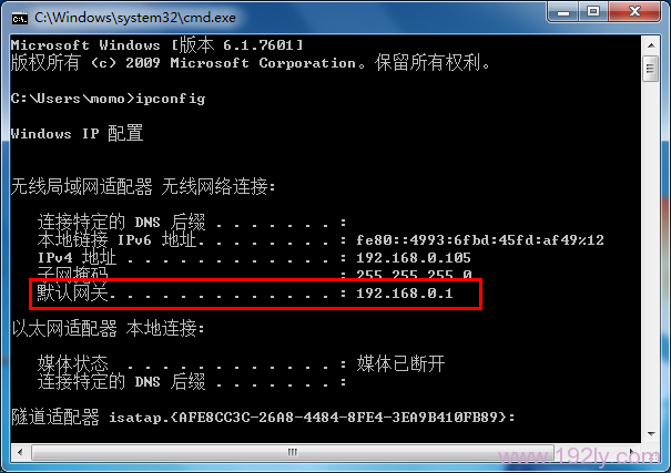 (4)、在結(jié)果中尋找“默認(rèn)網(wǎng)關(guān)”的地址,如下圖所示,其默認(rèn)網(wǎng)關(guān)地址為:192.168.0.1。
