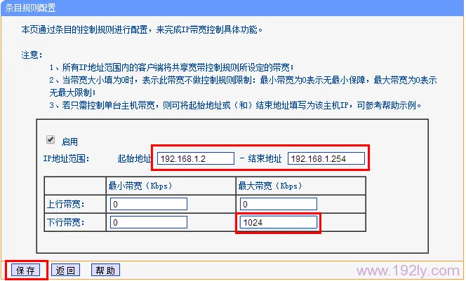 3、定義限速范圍及參數(shù):“起始地址”一欄填入192.168.1.2,“結(jié)束地址”設(shè)為192.168.1.254——> 在“模式”下拉菜單中選擇“限制最大帶寬”,并將“寬帶大小”設(shè)定為1024Kbps——> 對(duì)應(yīng)勾選“啟用”復(fù)選框——> 最后點(diǎn)擊保存。