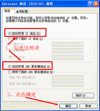 4、選擇“自動獲得IP地址”,“自動獲得DNS服務器地址”,然后點擊“確定”。
