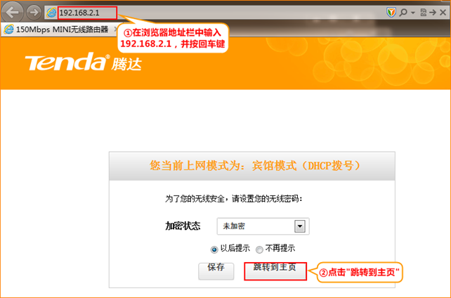 1. 在瀏覽器中輸入192.168.2.1 按回車鍵(Enter鍵)——>在跳轉(zhuǎn)的頁面中點擊“跳轉(zhuǎn)到主頁”。(如果192.168.2.1打不開,請閱讀文章: