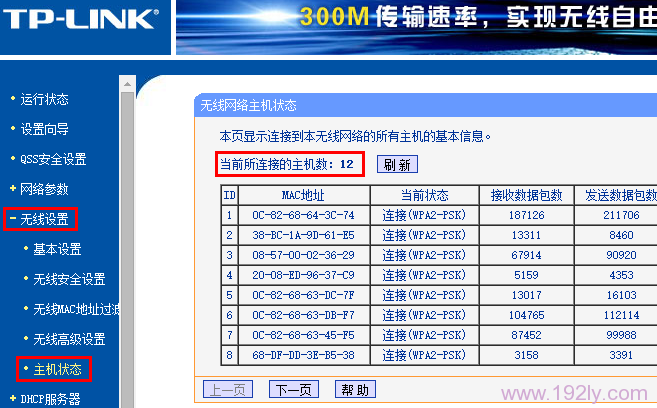 進(jìn)入“無線設(shè)置” -> “主機(jī)狀態(tài)” -> 查看“當(dāng)前所連接的主機(jī)數(shù)”。例如,若顯示當(dāng)前所連接的主機(jī)數(shù)為12,則表明有12臺(tái)無線設(shè)備連接到了該無線路由器。