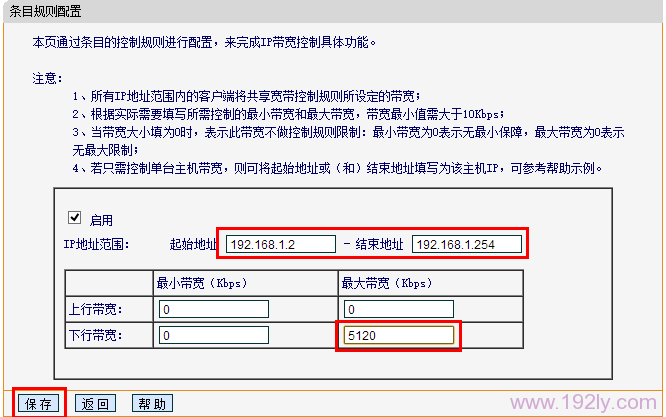 3、添加具體限速條目:勾選“啟用”—->在“起始地址”中填入192.168.1.2,在“結(jié)束地址”中填入192.168.1.254—->分別在“最大寬帶”與“下行寬帶”的對(duì)應(yīng)位置填寫5120—->最后點(diǎn)擊“保存”。