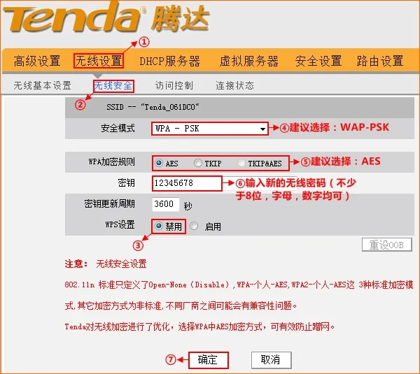 3、繼續(xù)點(diǎn)擊“無線設(shè)置” > “無線安全”,禁用WPS設(shè)置,選擇安全模式為“WPA-PSK”,加密規(guī)則設(shè)置為“AES”,設(shè)定無線WiFi的密碼(至少8位且不包含中文字符),完成后點(diǎn)擊“確定”保存設(shè)置。