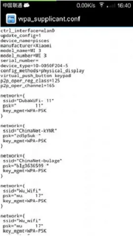 3、打開名為wpa_supplicant.conf的文件,使用文本閱讀工具查看,其中包含手機記錄的所有WiFi信息。
