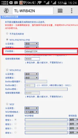 3、進入“無線設置”——>“安全設置”,在“PSK密碼”字段后找到WiFi密碼。