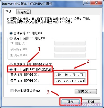 5、選擇“使用下面的DNS服務器地址”,將“首選DNS服務器”設為:180.76.76.76,“備用DNS服務器”設為:114.114.114.114,最后點擊“確定”: