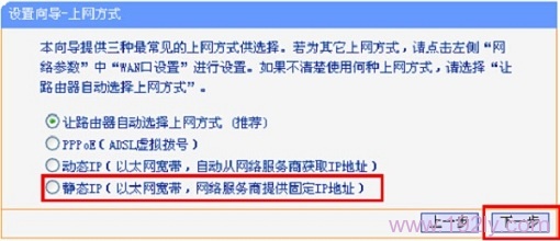 3、選擇“靜態(tài)IP(以太網(wǎng)寬帶,網(wǎng)絡服務商提供固定IP地址)”——>“下一步”。