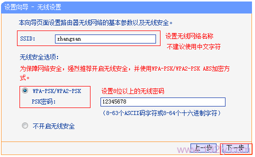 5、配置無線網(wǎng)絡:“SSID”為無線網(wǎng)絡名稱,用戶可根據(jù)需求自定義——>勾選“WPA-PSK/WPA2-PSK”加密方式——>設置“PSK密碼”——>點擊“下一步”。