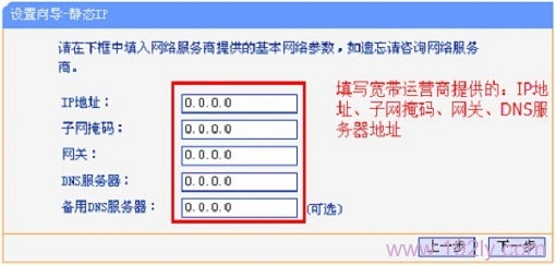 4、填寫寬帶服務提供商提供的靜態(tài)IP地址、子網(wǎng)掩碼、網(wǎng)關和DNS服務器地址——>“下一步”。