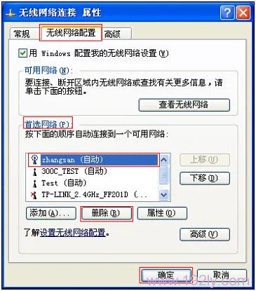 2、切換到“無線網(wǎng)絡(luò)配置”選項(xiàng)卡,在“首選網(wǎng)絡(luò)”列表中找到需要?jiǎng)h除的WiFi熱點(diǎn)名稱(例如:zhangshan),選中后點(diǎn)擊“刪除”,最后點(diǎn)擊“確定”完成操作。
