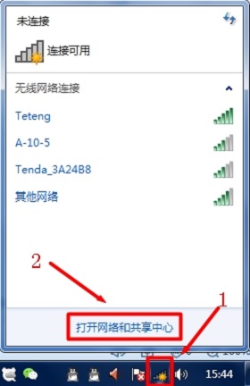 1、點(diǎn)擊屏幕右下角的無線圖標(biāo)——>選擇“打開網(wǎng)絡(luò)和共享中心”