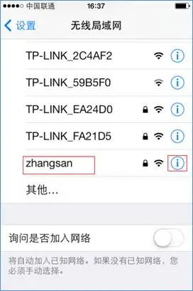 (1)、進入“無線局域網(wǎng)”(Wi-Fi)設置菜單,找到需要刪除的WiFi信號(例如:zhangshan)——>點擊zhangshan后面的藍色感嘆號,如下圖所示