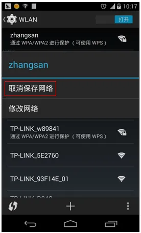在WLAN設置界面,找到需要刪除的無線信號(例如:zhangshan),然后長按該信號,在彈出的菜單中選擇“取消保存網(wǎng)絡”或“不保存網(wǎng)絡”。這樣就能刪除安卓手機中保存的該WiFi信號的配置文件。
