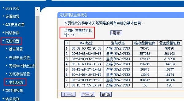 可以通過登錄路由器管理界面查看當(dāng)前連接的無線設(shè)備數(shù)量。對(duì)于老款路由器,可在“無線設(shè)置”——>“主機(jī)狀態(tài)”中查看。