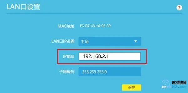 定位到路由器2的“LAN口設(shè)置”選項(xiàng),將LAN口的IP地址更改為:192.168.2.1,如下圖所示。