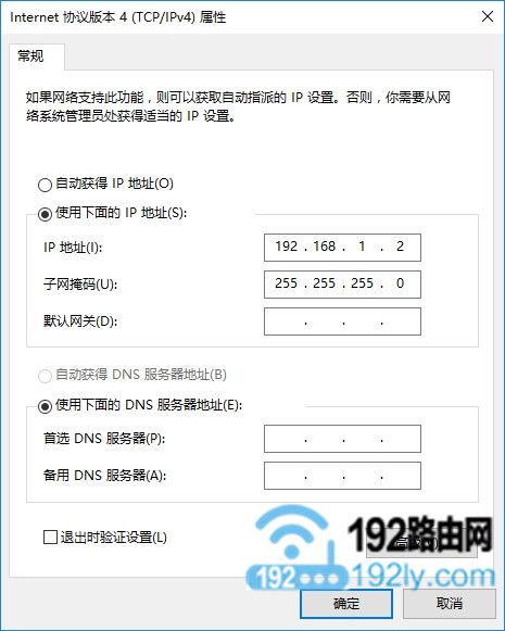若路由器的IP地址為:192.168.1.1,則電腦的IP地址可設(shè)為:192.168.1.2,子網(wǎng)掩碼為:255.255.255.0,其余參數(shù)無(wú)需設(shè)置。