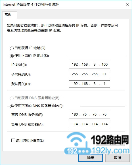 若路由器的IP地址為:192.168.3.1,則電腦的IP地址可設(shè)為:192.168.3.2,子網(wǎng)掩碼為:255.255.255.0,其余參數(shù)無(wú)需設(shè)置。