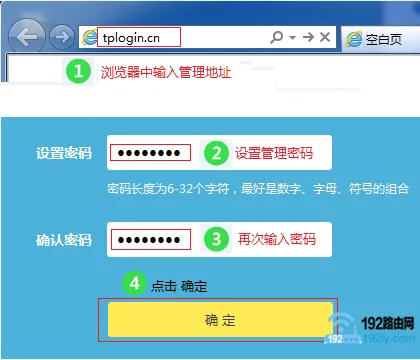打開電腦上的瀏覽器,在瀏覽器的地址欄中輸入:tplogin.cn 然后按下回車鍵——>在“設置密碼”、“確認密碼”中,為這臺路由器設置一個登錄密碼——>點擊“確定”。