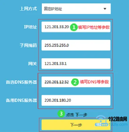 (2)、如果公司內(nèi)網(wǎng)是靜態(tài)IP上網(wǎng),這里的“上網(wǎng)方式”就選擇:固定IP地址——>然后填寫之前你電腦中的靜態(tài)IP、子網(wǎng)掩碼、網(wǎng)關、首選DNS、備用DNS——>點擊“下一步”。