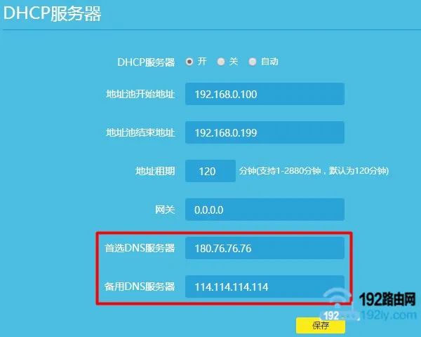 解決方法也很簡單,登錄路由器管理界面,在“DHCP服務(wù)器”選項(xiàng)下綁定DNS服務(wù)器地址,手動填寫:180.76.76.76114.114.114.114 這兩個DNS服務(wù)器地址,然后保存。