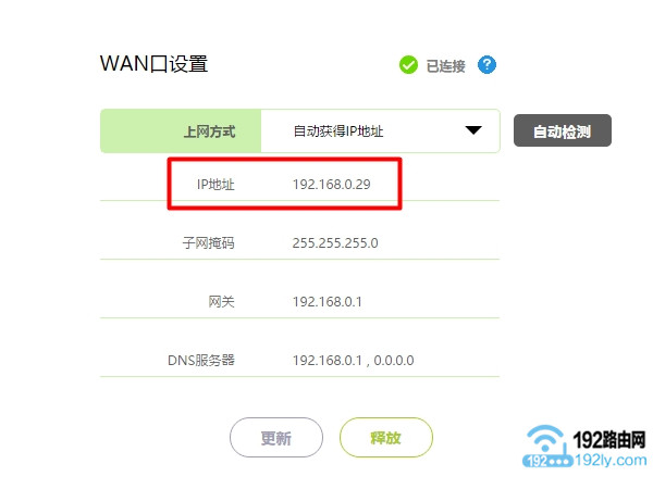 無線路由器接入寬帶網絡后,會從寬帶運營商那里獲得一個IP地址,這個IP地址可以在路由器的“上網設置”或者“WAN口狀態(tài)”菜單下查看,如下圖所示。