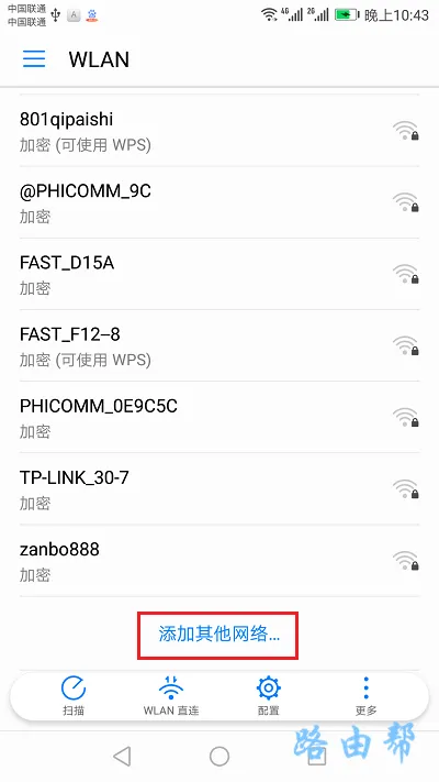 1、當(dāng)你將路由器的WiFi信號設(shè)置為隱藏之后,你會發(fā)現(xiàn)自己的手機(jī)也無法再搜索到原先的WiFi信號了。此時(shí),若想連接隱藏的WiFi,只能在手機(jī)中手動添加相關(guān)信息,具體操作步驟如下: