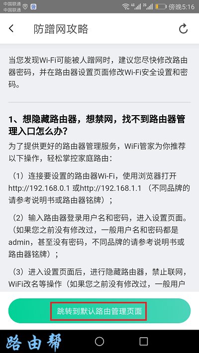 (2)在“防蹭攻略”頁面的底部,點(diǎn)擊“跳轉(zhuǎn)到默認(rèn)路由管理頁面”,如下圖所示。