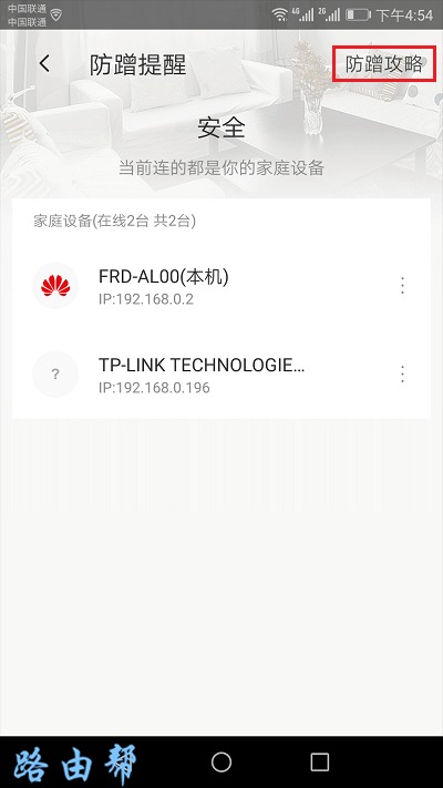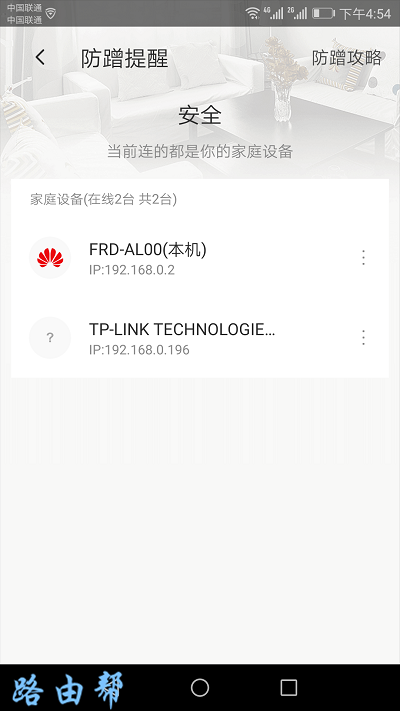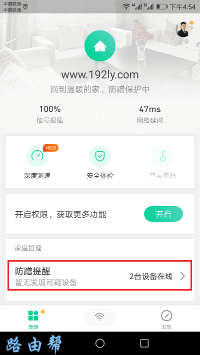 (6)返回APP主界面,會(huì)發(fā)現(xiàn)多出了一個(gè)“防蹭提醒”的功能模塊,它會(huì)顯示當(dāng)前連接WiFi的設(shè)備數(shù)量。