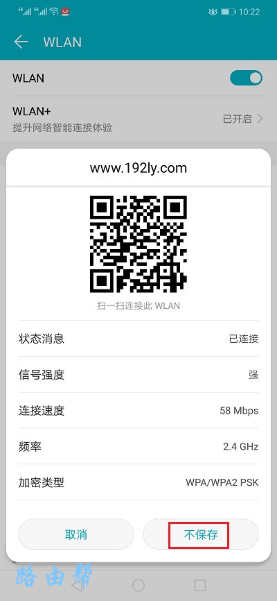 具體操作為,點(diǎn)擊你要連接的WiFi名稱(chēng)(如:www.192ly.com),然后選擇“不保存”或“忘記”,如下圖所示。
