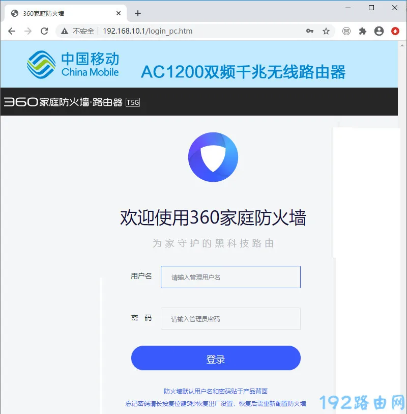 2. 接下來,在電腦或手機的瀏覽器地址欄內輸入 wifi.cmcc 或 192.168.10.1中的任一地址,即可跳轉至路由器的登錄界面。在此頁面輸入正確的用戶名與密碼,便可進入路由器的設置頁面。